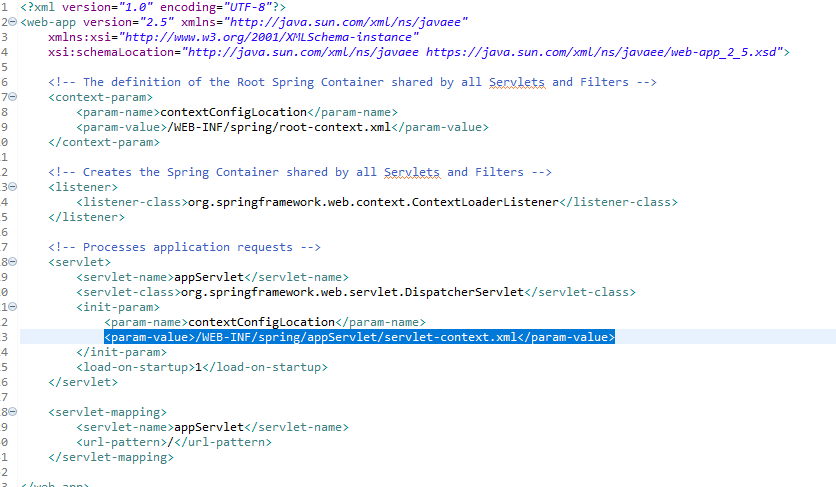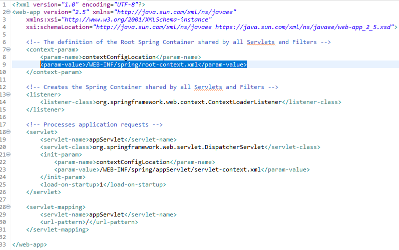 3. web.xml을 열어서 원래 root-context로 지정된 내용을 새로만든 context의 내용을 참고하도록 아래코드로 수정한다.