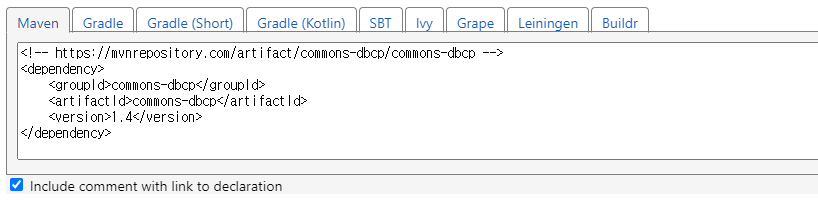 2. 1) mvnrepository 사이트에서 Commons DBCP를 검색하여 1.4 버전을 누른다.